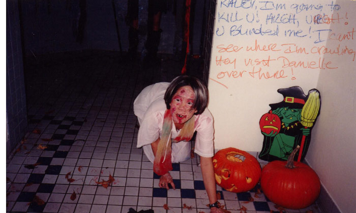 Getting up there now!! I was really involved with Ray Cam this year & at this point in my life. This was the first year of the Ray cam haunted house for the little kids. Basically we would take over either the girls or guys changeroom downstairs and transform that into a haunted house with a very miniscule budget and our imaginations (and a lot of cardboard & garbage bags). We’d get as much as we could from our planning committee trips to Value Villiage or Superstore. We’d make a cardboard tunnel from the entrance, glueing scary masks, spiders & whatnot to the sides. In the bathroom stalls we’d put scary stuff in it or have someone in costume jumping out to scare the kids. I mean, these are LITTLE kids we’re talking about, like 4-10 years old so it wouldn’t take that much, thank goodness. cuz we really had nothing!